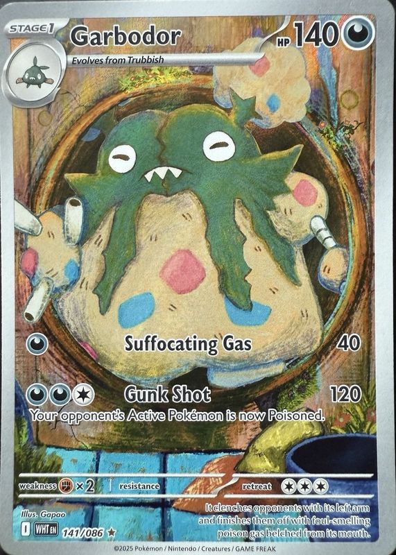 The Garbodor 2025 Scarlet & Violet: White Flare #141/086 Illustration Rare card in Raw TCG (Lightly Played) condition has not changed in price in the last 30 days and was last sold for $12.00 .
