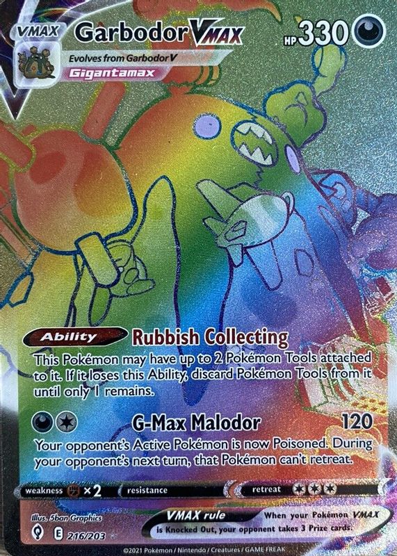 The Garbodor VMAX 2021 Sword & Shield: Evolving Skies #216/203 Holo (Secret) card in Raw TCG (Near Mint) condition has moved up $8.62 (+178%) in the last 30 days and was last sold for $13.46 .