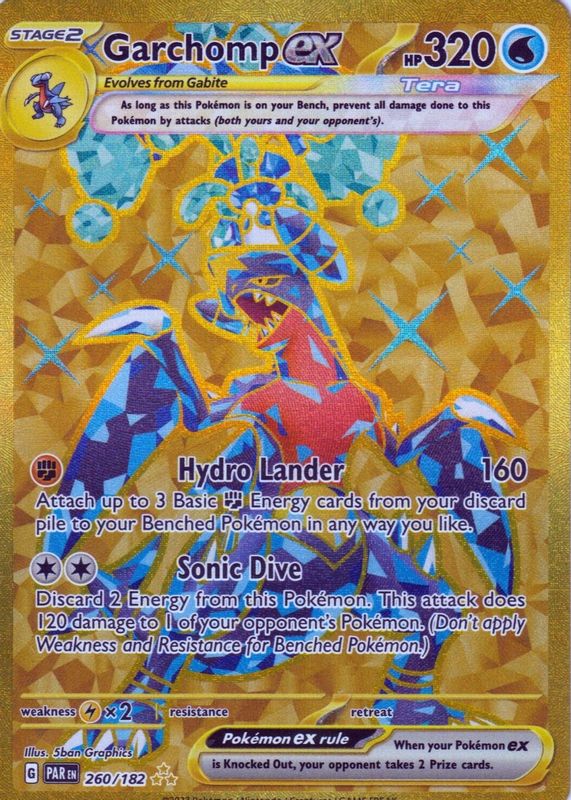 The Garchomp ex 2023 Scarlet & Violet: Paradox Rift #260/182 Hyper Rare (Secret) card in Raw TCG (Near Mint) condition has moved down -$0.52 (-4.8%) in the last 30 days and was last sold for $10.48 .