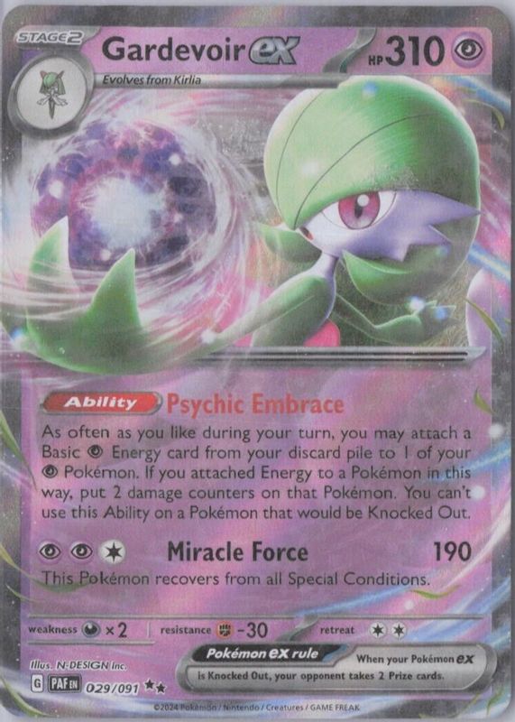 The Gardevoir ex 2024 Scarlet & Violet: Paldean Fates #029/091 Double Rare card in Raw TCG (Near Mint) condition has moved up $0.16 (+7.4%) in the last 30 days and was last sold for $2.32 .