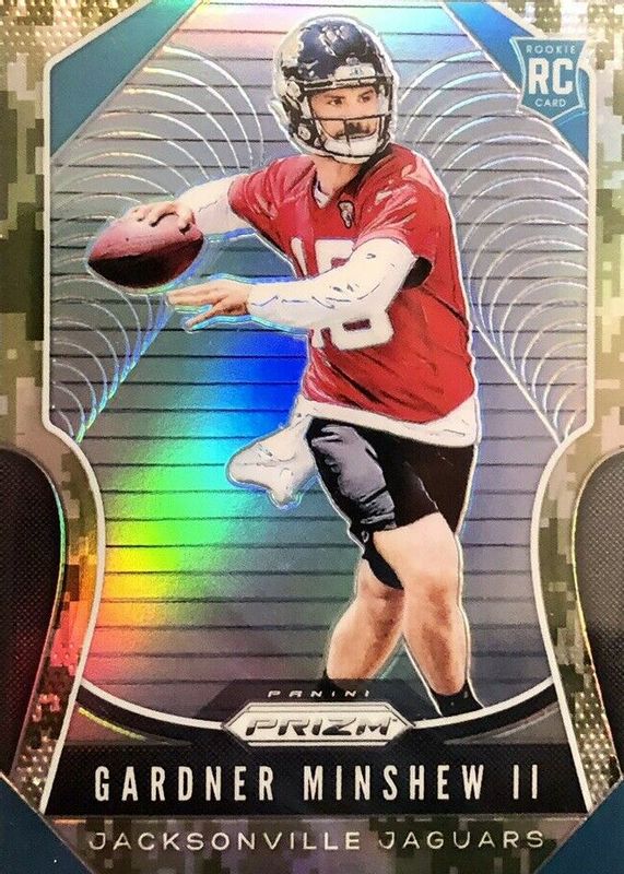 The Gardner Minshew II 2019 Prizm #322 Camo /25 Rookie card in Raw condition has not changed in price in the last 30 days and was last sold for $21.50 .