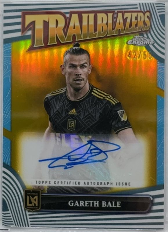 The Gareth Bale 2024 Topps Chrome MLS #TA-GB MLS Trailblazers Autographs - Gold Refractor /50 card is 1 of 43 Gareth Bale's card variations in the 2024 Topps Chrome MLS set being tracked by Sports Card Investor, including Base, Aqua Lava Refractor, Gold Lava Refractor, Neon Green Lava Refractor, and Prism Refractor.