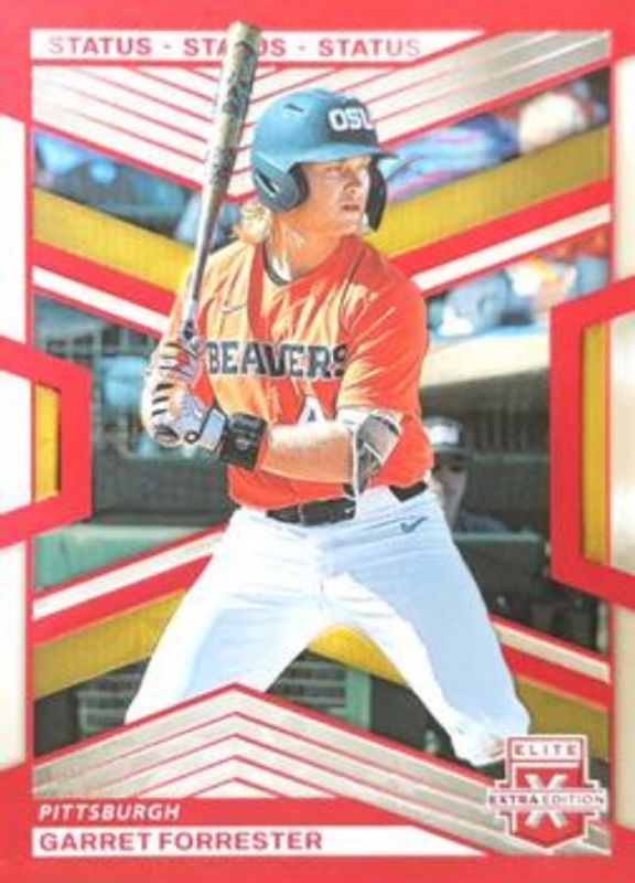 The Garret Forrester 2023 Elite Extra Edition #96 Status Red /199 card is 1 of 39 Garret Forrester's card variations in the 2023 Elite Extra Edition set being tracked by Sports Card Investor, including Base, Pink, Signatures, Status Green /499, and Signatures die-cut /399.