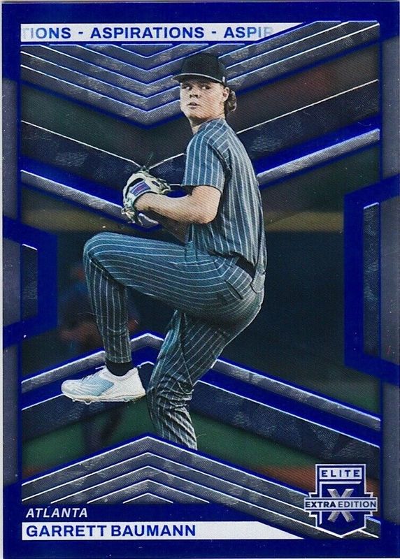 The Garrett Baumann 2023 Elite Extra Edition #30 Aspirations Blue /349 card is 1 of 39 Garrett Baumann's card variations in the 2023 Elite Extra Edition set being tracked by Sports Card Investor, including Base, Pink, Signatures, Status Green /499, and Signatures die-cut /399.