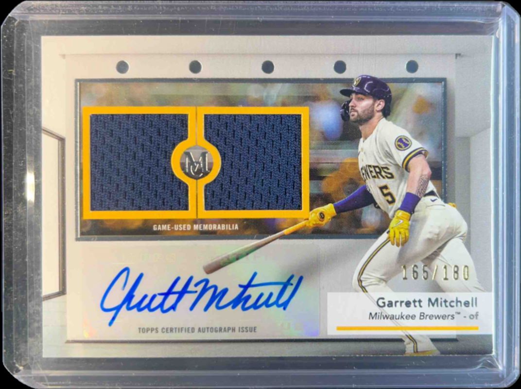 The Garrett Mitchell 2024 Topps Museum Collection #SWDRA-GM Single Player Signatures Swatches Dual Relic Autographs /299 card is 1 of 10 Garrett Mitchell's card variations in the 2024 Topps Museum Collection set being tracked by Sports Card Investor, including Single Player Signatures Swatches Dual Relic Autographs - Pink /99, Single Player Signatures Swatches Dual Relic Autographs - Copper /50, Single Player Signatures Swatches Dual Relic Autographs - Gold /25, Single Player Signatures Swatches Dual Relic Autographs - Sapphire /20, and Single Player Signatures Swatches Dual Relic Autographs - Amethyst /15.