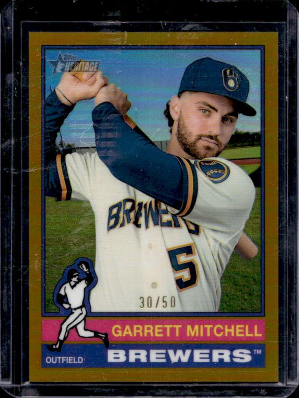 The Garrett Mitchell 2025 Topps Heritage #479 Chrome - Gold Refractor /50 card is 1 of 24 Garrett Mitchell's card variations in the 2025 Topps Heritage set being tracked by Sports Card Investor, including Base, Black Border, Dark Blue Border, Dark Green Border, and Dark Yellow Border.