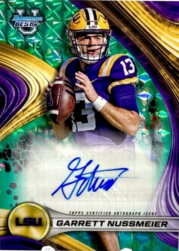 This card is 1 of 17 Garrett Nussmeier's card variations in the 2024 Bowman Best University set being tracked by Sports Card Investor, including Best of 2024 Autographs - Refractor, Best of 2024 Autographs - Pink Lava Refractor /100, Best of 2024 Autographs - Green Mini-Diamond Refractor /99, Best of 2024 Autographs - Yellow Refractor /75, and Best of 2024 Autographs - Gold Refractor /50.