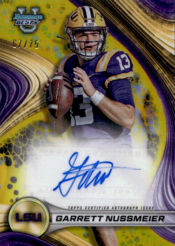 Best Prices Available For Sale of Garrett Nussmeier 2024 Bowman Best University #BOA-GN Best of 2024 Autographs - Yellow Refractor /75
