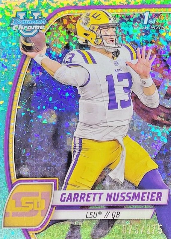 This card is 1 of 43 Garrett Nussmeier's card variations in the 2024 Bowman Chrome University set being tracked by Sports Card Investor, including Base (1st), Pink Lava Refractor (1st), Purple Shimmer Refractor (1st), Refractor (1st), and Stealth Refractor (1st).
