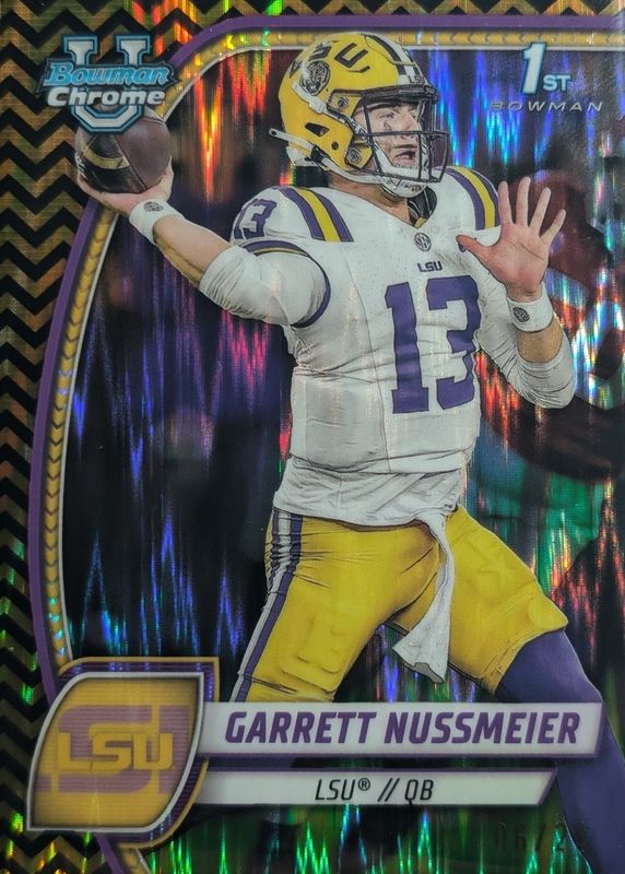 This card is 1 of 43 Garrett Nussmeier's card variations in the 2024 Bowman Chrome University set being tracked by Sports Card Investor, including Base (1st), Pink Lava Refractor (1st), Purple Shimmer Refractor (1st), Refractor (1st), and Stealth Refractor (1st).