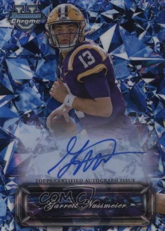 This card is 1 of 23 Garrett Nussmeier's card variations in the 2024 Bowman Chrome University Sapphire Edition set being tracked by Sports Card Investor, including Base (1st), Yellow /75 (1st), Gold /50 (1st), Orange /25 (1st), and Black /10 (1st).