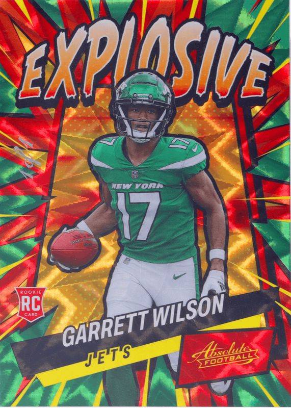This card is 1 of 7 Garrett Wilson's card variations in the 2022 Absolute set being tracked by Sports Card Investor, including Kaboom! (Vertical), Explosive /(SSP), Glass /(SSP), Explosive - Gold /10, and Kaboom! (Vertical) - Gold /10.