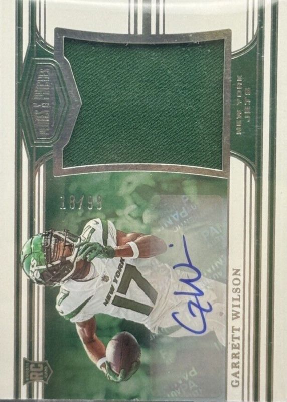 The Garrett Wilson 2022 Chronicles #PP-GAW Plates & Patches Rookie Jersey Autographs (/99) card in Raw condition has not changed in price in the last 30 days and was last sold for $40.00 .