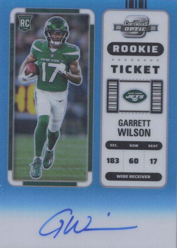This card is 1 of 46 Garrett Wilson's card variations in the 2022 Contenders Optic set being tracked by Sports Card Investor, including Base, Silver, Red /175, Blue /99, and Orange /50.