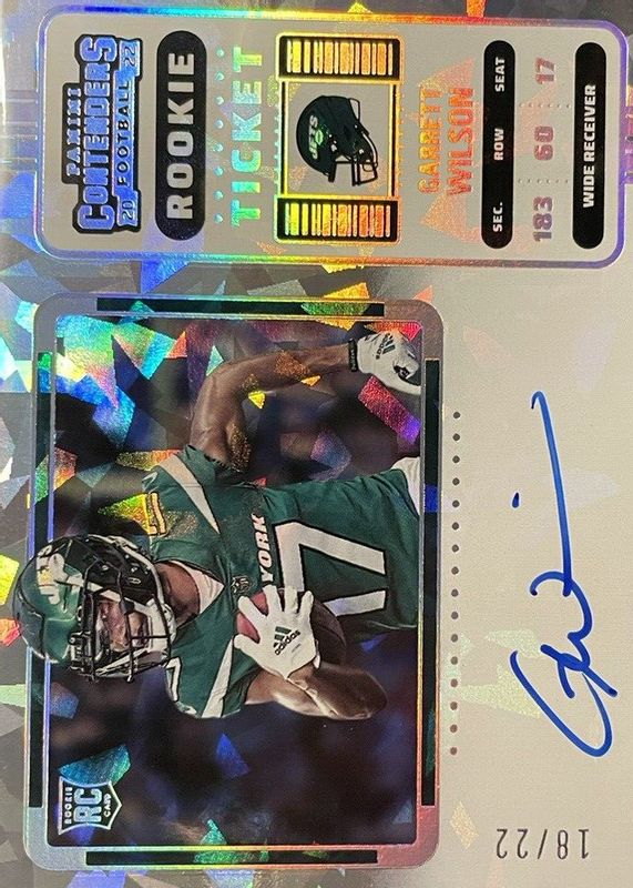 This card is 1 of 32 Garrett Wilson's card variations in the 2022 Contenders set being tracked by Sports Card Investor, including Rookie Ticket Auto, Rookie Ticket Auto - Red Zone Ticket, Rookie Ticket Auto - Silver (/49), Rookie Ticket Auto - Ticket Stub (/17), and Rookie Ticket Auto - Wild Card.