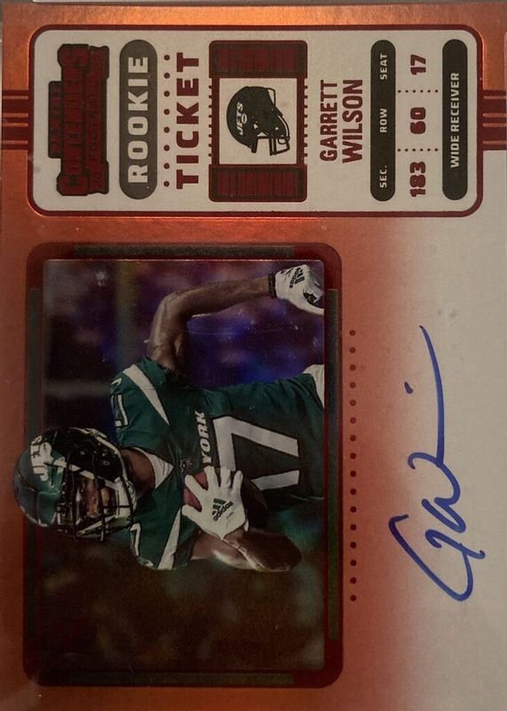 This card is 1 of 32 Garrett Wilson's card variations in the 2022 Contenders set being tracked by Sports Card Investor, including Rookie Ticket Auto, Rookie Ticket Auto - Red Zone Ticket, Rookie Ticket Auto - Silver (/49), Rookie Ticket Auto - Ticket Stub (/17), and Rookie Ticket Auto - Wild Card.