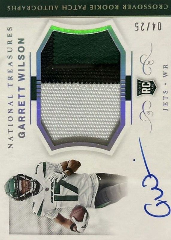 This card is 1 of 20 Garrett Wilson's card variations in the 2022 National Treasures set being tracked by Sports Card Investor, including Crossover Rookie Patch Autographs (/49), Rookie Patch Auto - Green Jersey Number (/17), Rookie Patch Auto /99, Rookie Patch Auto - Purple /49, and Rookie Patch Auto - Holo Silver /25.