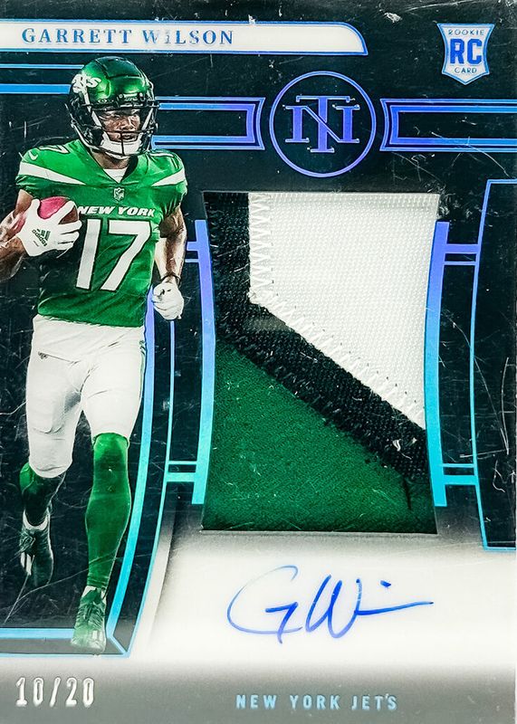 This card is 1 of 20 Garrett Wilson's card variations in the 2022 National Treasures set being tracked by Sports Card Investor, including Crossover Rookie Patch Autographs (/49), Rookie Patch Auto - Green Jersey Number (/17), Rookie Patch Auto /99, Rookie Patch Auto - Purple /49, and Crossover Rookie Patch Autographs - Holo Silver /25.