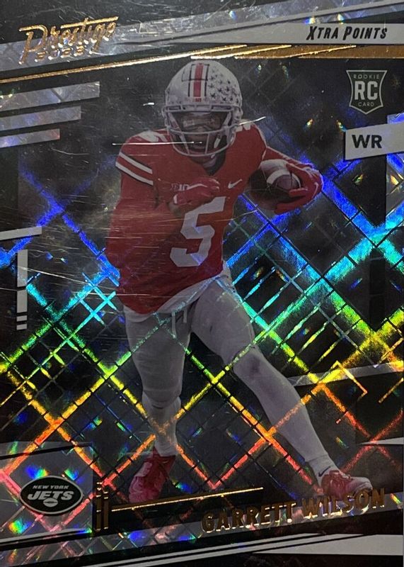 This card is 1 of 27 Garrett Wilson's card variations in the 2022 Prestige set being tracked by Sports Card Investor, including Base, Xtra Points Astral, Xtra Points Dots, Xtra Points Galaxy, and Xtra Points Sunburst.