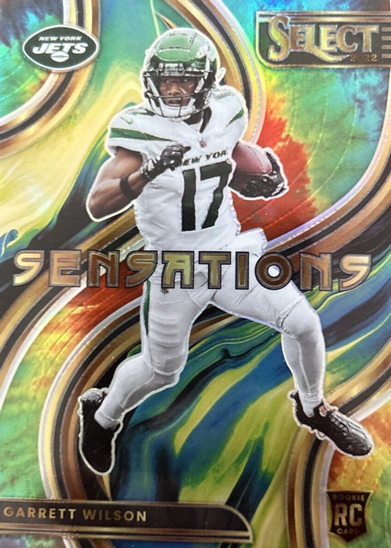 The Garrett Wilson 2022 Select #SEN-23 Sensations - Tie-Dye /25 Rookie card in Raw condition has not changed in price in the last 30 days and was last sold for $42.17 .