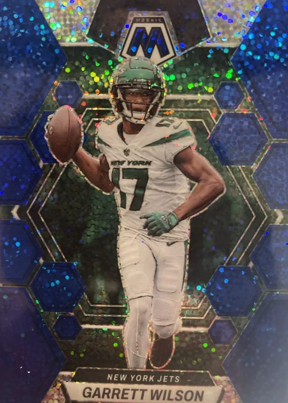 This card is 1 of 31 Garrett Wilson's card variations in the 2023 Mosaic set being tracked by Sports Card Investor, including Orange /199, Blue /99, Choice Fusion Red & Yellow /80, No Huddle Blue /75, and Choice Peacock /(SSP).