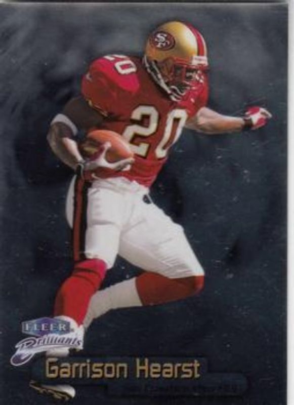 The Garrison Hearst 1998 Fleer Brilliants #22 Base card is 1 of 5 Garrison Hearst's card variations in the 1998 Fleer Brilliants set being tracked by Sports Card Investor, including #22B Blue, #22G Gold /99, #22TG Gold /99, and #22TG 24-Karat Gold /24.