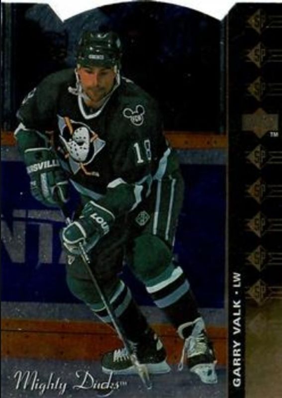 The Garry Valk 1994 Upper Deck #SP-3 SP die-cut card is 1 of 5 Garry Valk's card variations in the 1994 Upper Deck set being tracked by Sports Card Investor, including Base, Electric Ice, Ice Gallery, and SP.