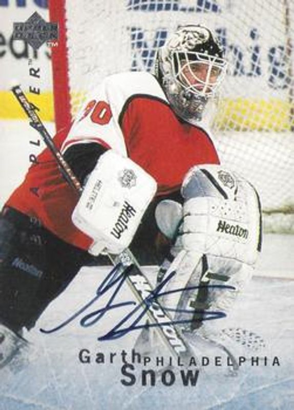 The Garth Snow 1995 Upper Deck Be a Player #S57 Autographs Rookie card is 1 of 3 Garth Snow's card variations in the 1995 Upper Deck Be a Player set being tracked by Sports Card Investor, including Base, and Autographs die-cut.