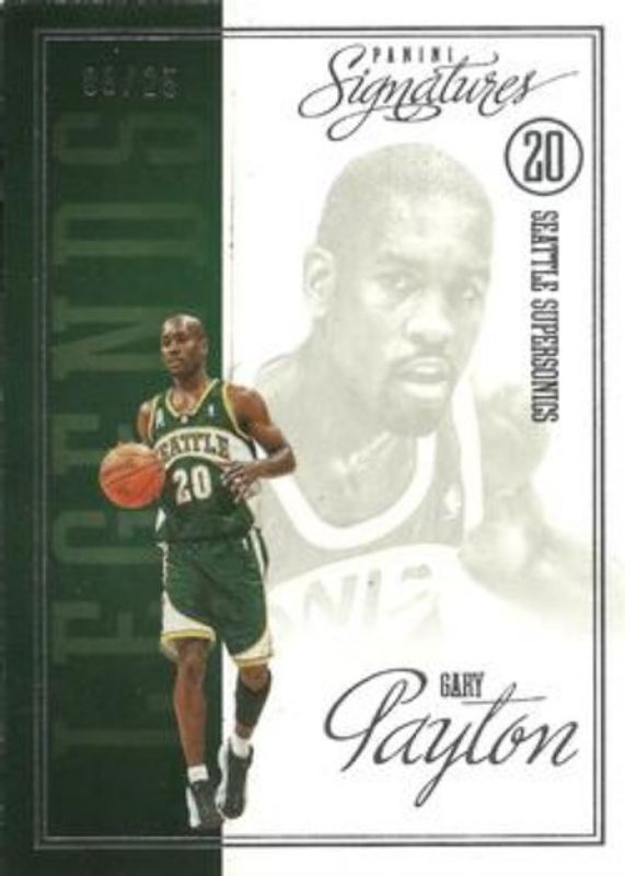 The Gary Payton 2012 Panini Signatures #33 Chase Legends /25 card is 1 of 42 Gary Payton's card variations in the 2012 Panini Signatures set being tracked by Sports Card Investor, including #120 Signatures Film Green, #120 Signatures Film Red, #185 Signatures Variations Platinum, #38 Chase Legends /25, and #39 Chase Legends /25.
