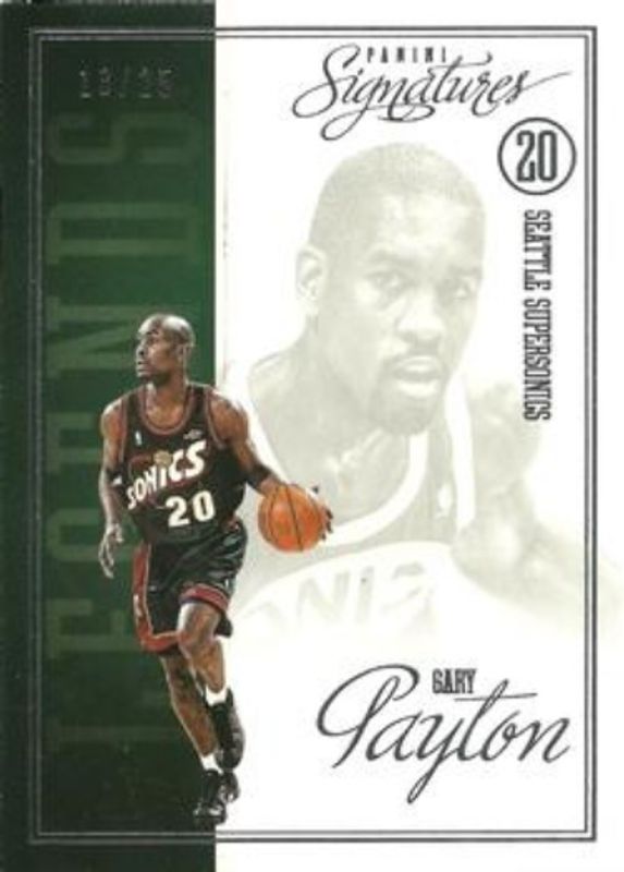 The Gary Payton 2012 Panini Signatures #39 Chase Legends /25 card is 1 of 42 Gary Payton's card variations in the 2012 Panini Signatures set being tracked by Sports Card Investor, including #120 Signatures Film Green, #120 Signatures Film Red, #185 Signatures Variations Platinum, #38 Chase Legends /25, and #40 Chase Legends /25.
