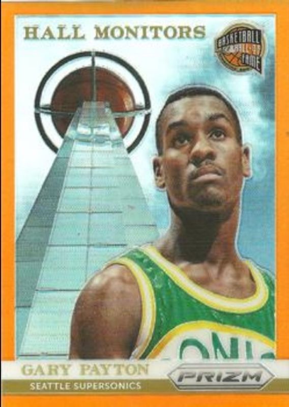 The Gary Payton 2013 Prizm #1 Hall Monitors - Orange /60 card is 1 of 32 Gary Payton's card variations in the 2013 Prizm set being tracked by Sports Card Investor, including Base, Blue, Green, Red, and Red White Blue Mosaic.