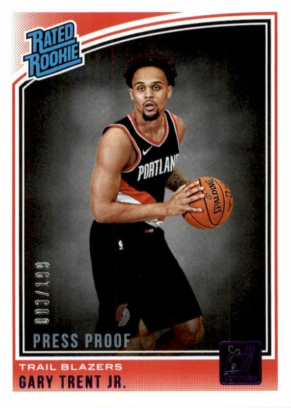 The Gary Trent Jr. 2018 Donruss #199 Press Proof Purple /199 Rookie card in Raw condition has not changed in price in the last 30 days and was last sold for $1.99 .