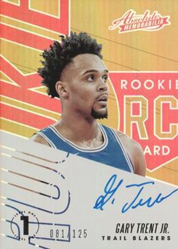 The Gary Trent Sr. 2018 Absolute Memorabilia #RA-GTJ Rookie Autographs /125 card is 1 of 28 Gary Trent Sr.'s card variations in the 2018 Absolute Memorabilia set being tracked by Sports Card Investor, including Base, 10th Anniversary /10, Maroon /7, Rookie Threads /199, and Rookie Threads Level 2 /149.