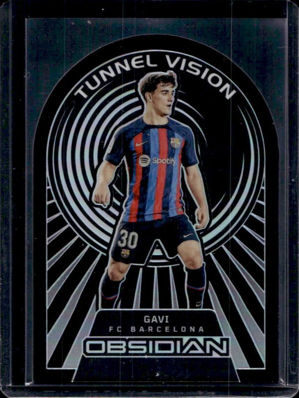 The Gavi 2022 Obsidian #18 Tunnel Vision /115 card is 1 of 76 Gavi's card variations in the 2022 Obsidian set being tracked by Sports Card Investor, including Base /115, Electric Etch Orange /40, Electric Etch Red Pulsar /30, Electric Etch Purple Flood /25, and Electric Etch Blue /20.