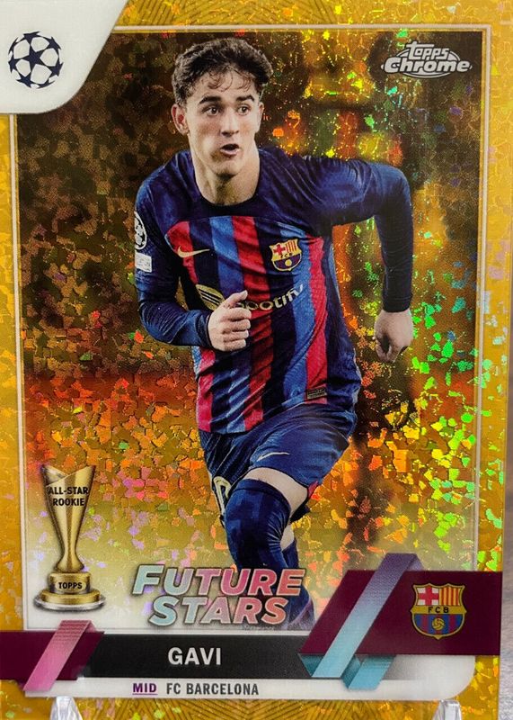 This card is 1 of 11 Gavi's card variations in the 2022 Topps Chrome UEFA Club Competitions set being tracked by Sports Card Investor, including Color Match Variation /99, Blue & Gold Seismic Refractor /75, Toppsfractor /52, Gold Refractor /50, and Hero Variation /(SSP).