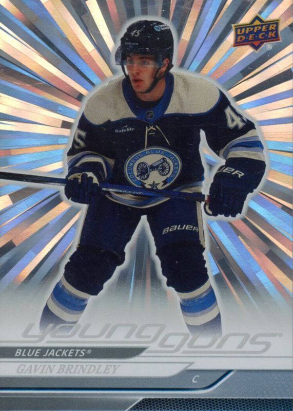 This card is 1 of 8 Gavin Brindley's card variations in the 2024 Upper Deck set being tracked by Sports Card Investor, including Young Guns Base, Young Guns - Clear Cut, Young Guns - Deluxe /250, Young Guns - UD Exclusives /100, and Young Guns - Outburst Red /25.