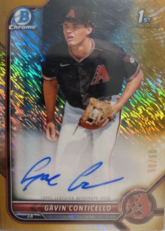 Best Prices Available For Sale of Gavin Conticello 2022 Bowman #CPA-GC Chrome Prospect Auto - Gold Refractor /50 (1st)