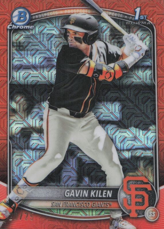 The Gavin Kilen 2025 Bowman Draft Mega Box #BDC-40 Chrome - Orange Mega Refractor /25 (1st) card in Raw condition has not changed in price in the last 30 days and was last sold for $72.49 .