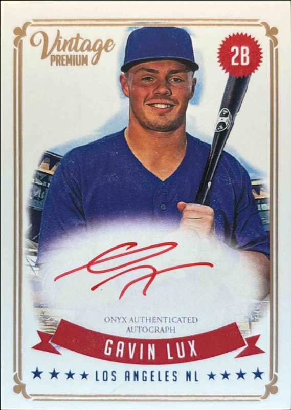 The Gavin Lux 2020 Onyx Vintage Premium #PAGL Autographed Green Ink /20 Rookie card is 1 of 5 Gavin Lux's card variations in the 2020 Onyx Vintage Premium set being tracked by Sports Card Investor, including Base, Autographed Blue Ink, Autographed Red Ink, and Autographed Black Ink /1.
