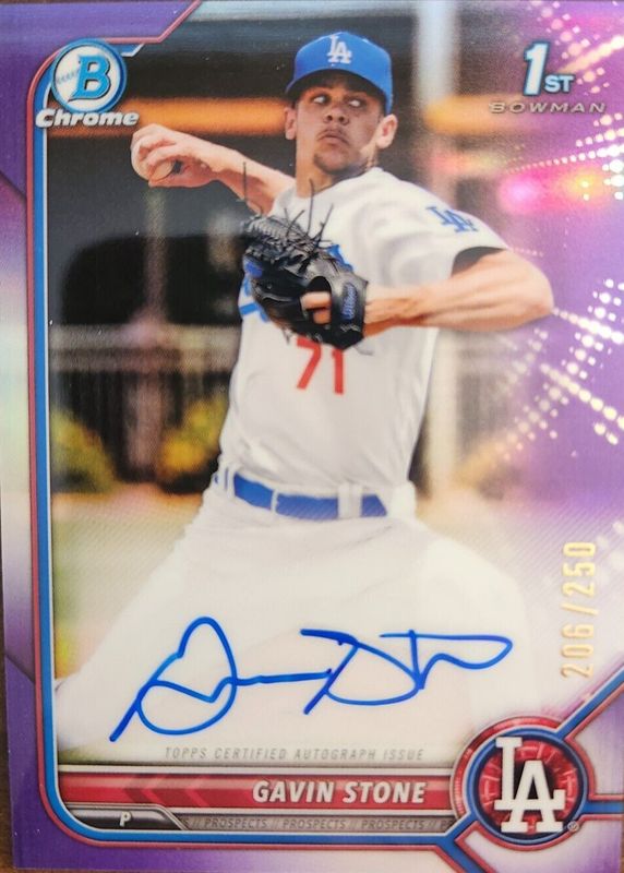 This card is 1 of 22 Gavin Stone's card variations in the 2022 Bowman Chrome set being tracked by Sports Card Investor, including Prospect Auto - Black & White Mini-Diamond Refractor (1st), Prospect Auto - Refractor /499 (1st), Prospect Auto - Speckle Refractor /299 (1st), Prospect Auto - Purple Refractor /250 (1st), and Prospect Auto - Blue RayWave Refractor /150 (1st).
