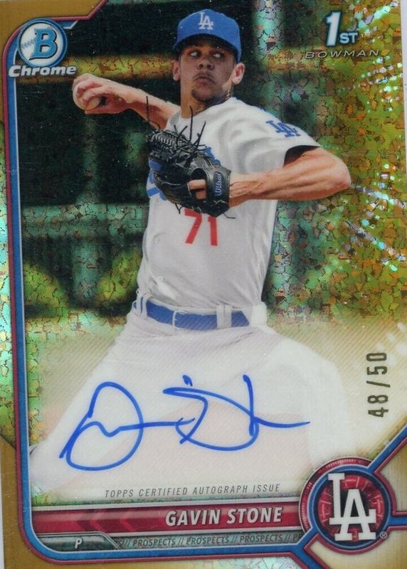 The Gavin Stone 2022 Bowman Chrome #CPA-GS Prospect Auto - Gold Mini-Diamond Refractor /50 (1st) card in Raw condition has not changed in price in the last 30 days and was last sold for $58.00 .