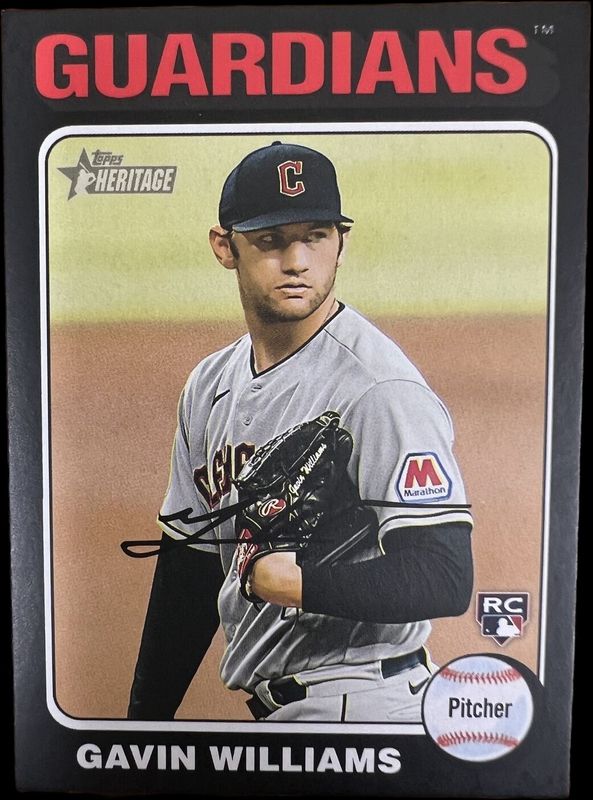 The Gavin Williams 2024 Topps Heritage #489 Black Border Rookie card is 1 of 23 Gavin Williams' card variations in the 2024 Topps Heritage set being tracked by Sports Card Investor, including #489 Base, #489c Base, #489b Base, #CCR-GW Clubhouse Collection Relics, and #CCR-GW Clubhouse Collection Relics - Gold /99.