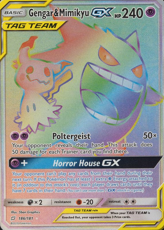 Pokemon Sun & Moon Team Up Gengar & Mimikyu GX 186/181 NM Rainbow Rare Tag Team