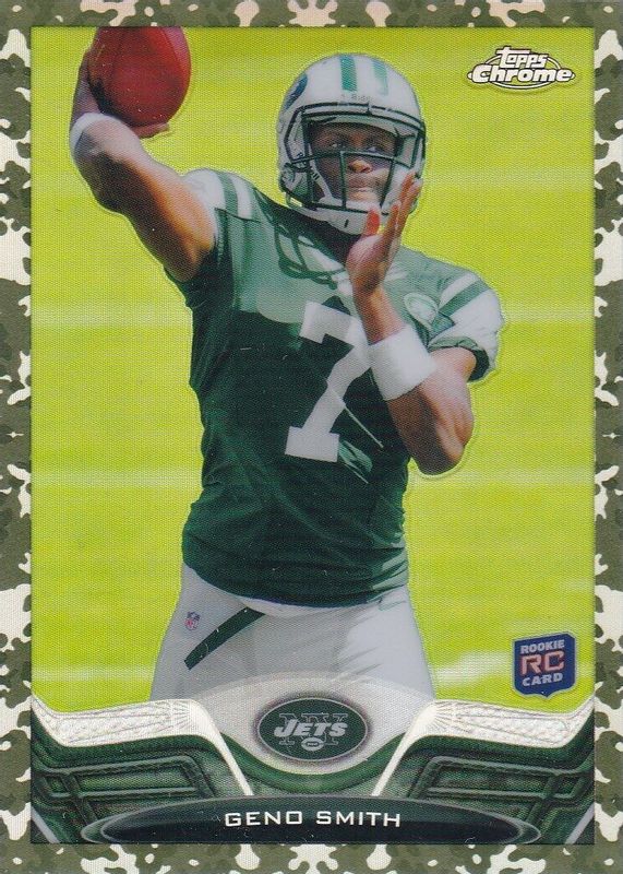 The Geno Smith 2013 Topps Chrome #21 Camo Refractor /499 Rookie card in Raw condition has not changed in price in the last 30 days and was last sold for $6.50 .