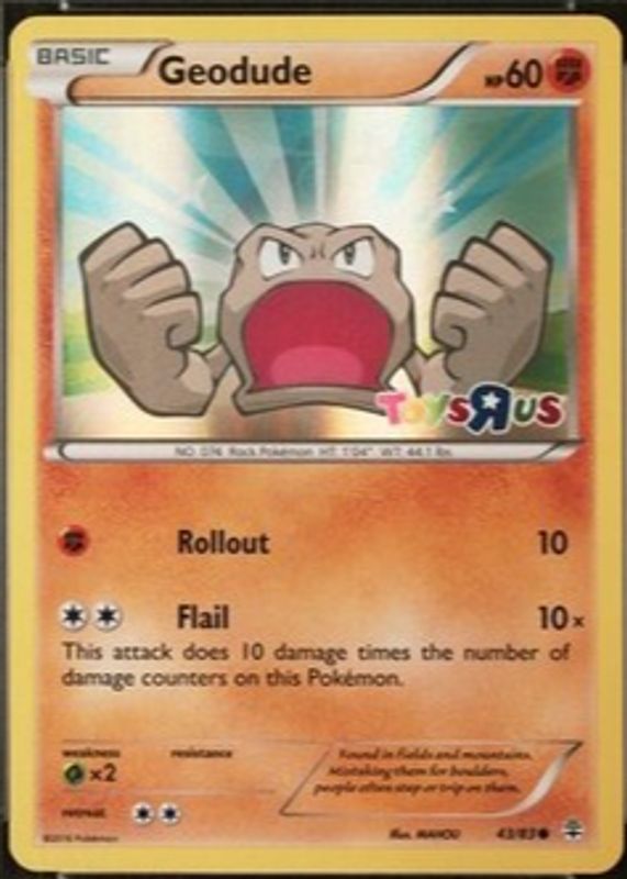 The Geodude 2016 XY: Generations #43/83 Promo (Toys R Us) card in Raw TCG (Near Mint) condition has not changed in price in the last 30 days and was last sold for $19.99 .