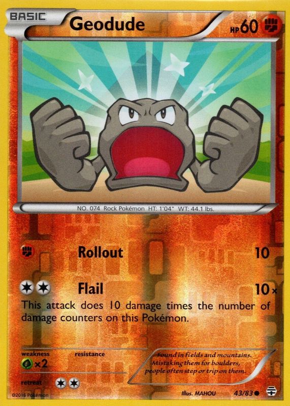 The Geodude 2016 XY: Generations #43/83 Reverse Holo card in Raw TCG (Near Mint) condition has moved up $1.09 (+62.3%) in the last 30 days and was last sold for $2.84 .