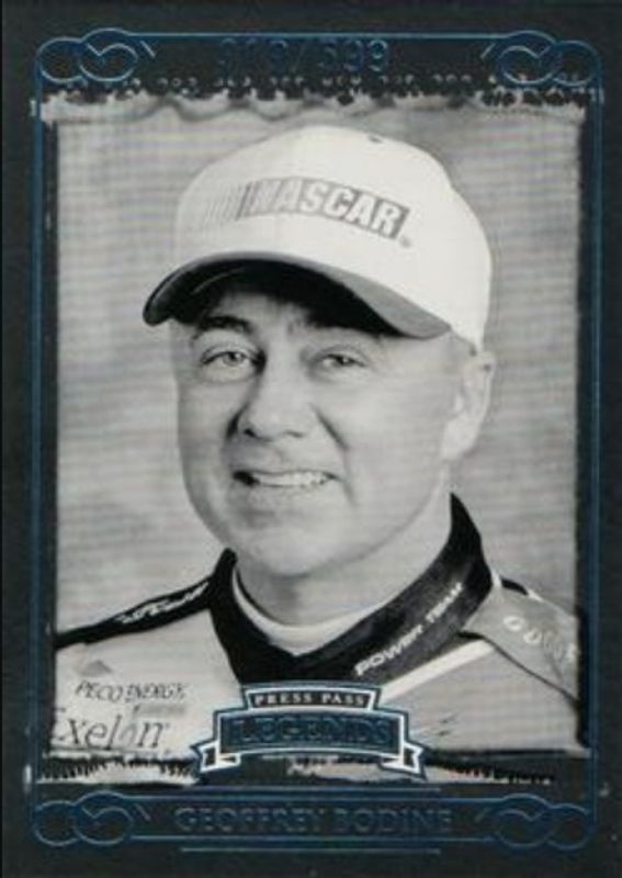 The Geoff Bodine 2008 Press Pass Legends #6 Blue /599 card is 1 of 22 Geoff Bodine's card variations in the 2008 Press Pass Legends set being tracked by Sports Card Investor, including Base, Bronze /299, Gold /99, Holo /25, and eBay Previews Red /5.