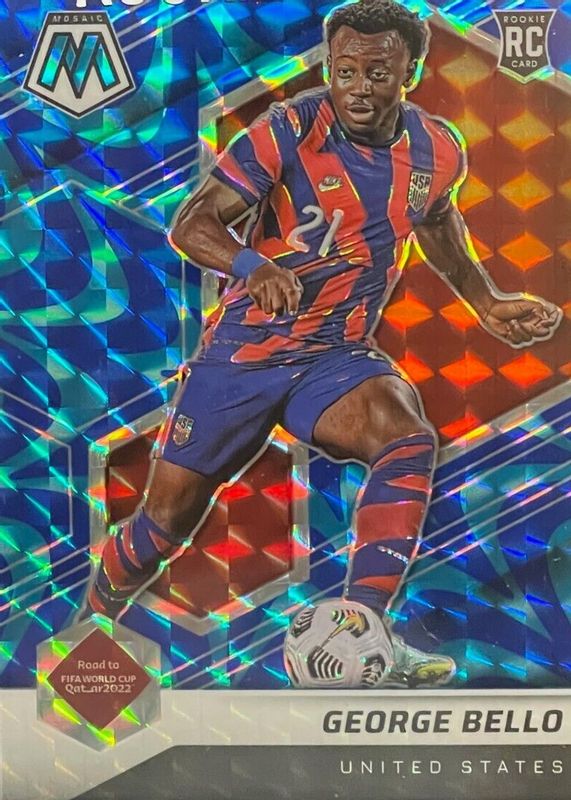 The George Bello 2021 Mosaic Road to FIFA World Cup #105 Reactive Blue Rookie card in Raw condition has not changed in price in the last 30 days and was last sold for $3.99 .