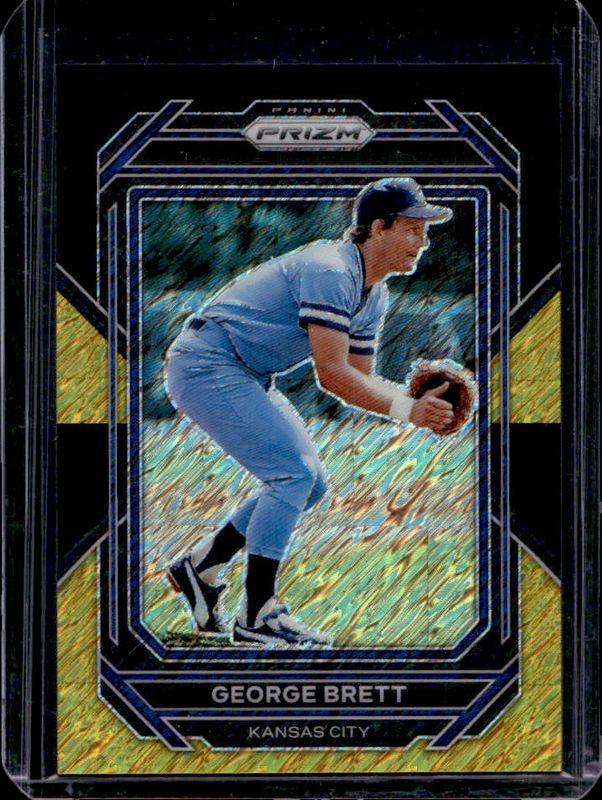 The George Brett 2023 Prizm #81 Black Gold Shimmer /5 card is 1 of 38 George Brett's card variations in the 2023 Prizm set being tracked by Sports Card Investor, including Base, Blue Ice, Giraffe, Green Ice, and Hyper.