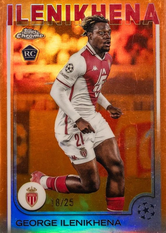 The George Ilenikhena 2024 Topps Chrome UEFA Club Competitions #185 Orange Refractor /25 Rookie card in Raw condition has not changed in price in the last 30 days and was last sold for $26.00 .